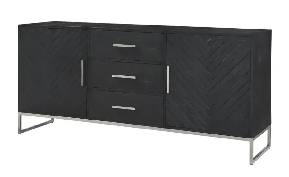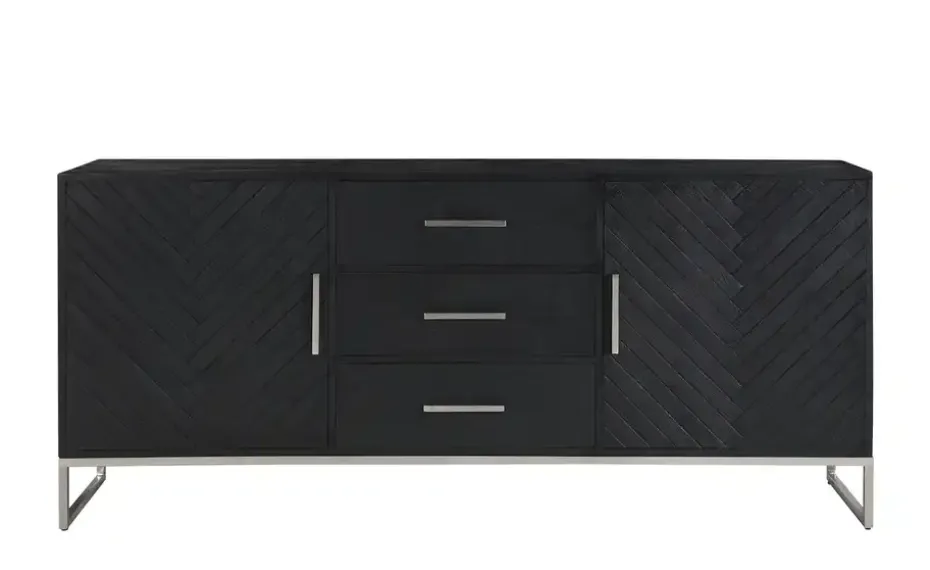 Das Sideboard Noire ist mit seiner Breite von 180 Zentimetern perfekt für Deko-Elemente wie Pflanzen, Vasen oder Bücher. Das schwarze Mango-Massivholz besitzt an den beiden äußeren Türen ein attraktives Fischgrätenmuster. Die hellen Metallkufen und -Griffe heben sich gewollt von dem dunkleren Holz ab und setzen edle Akzente. Nutzen Sie den praktischen Stauraum der drei Schubfächer und der beiden äußeren Fächer: Ob für Fernsehzubehör, Geschirr oder Spiele, bleibt dabei Ihnen überlassen.