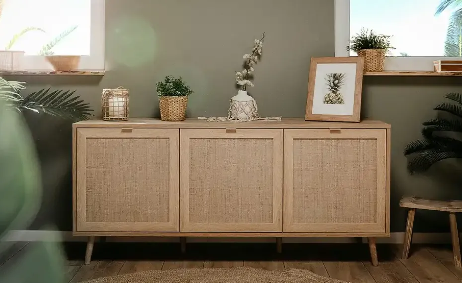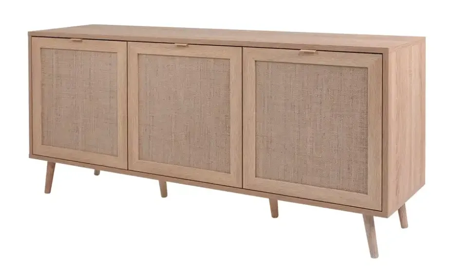 Das Sideboard Rafia macht in allen Wohnräumen eine gute Figur. Highlight des hellen Möbelstücks sind die drei Türen, die mit einer attraktiven 3D-Bastgeflecht-Optik sofort ins Auge stechen. Hinter den Türen liegen je zwei Fächer, die durch drei verstellbare Einlegeböden an Ihre Bedürfnisse angepasst werden können. Sechs schräg zulaufende Kegelfüße aus massivem Eichenholz geben dem Sideboard einen stabilen Stand. Die Serie Rafia erinnert an den beliebten Boho-Stil und fügt sich in nahezu alle Einrichtungskonzepte problemlos ein.