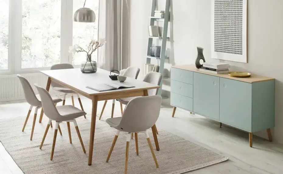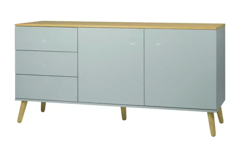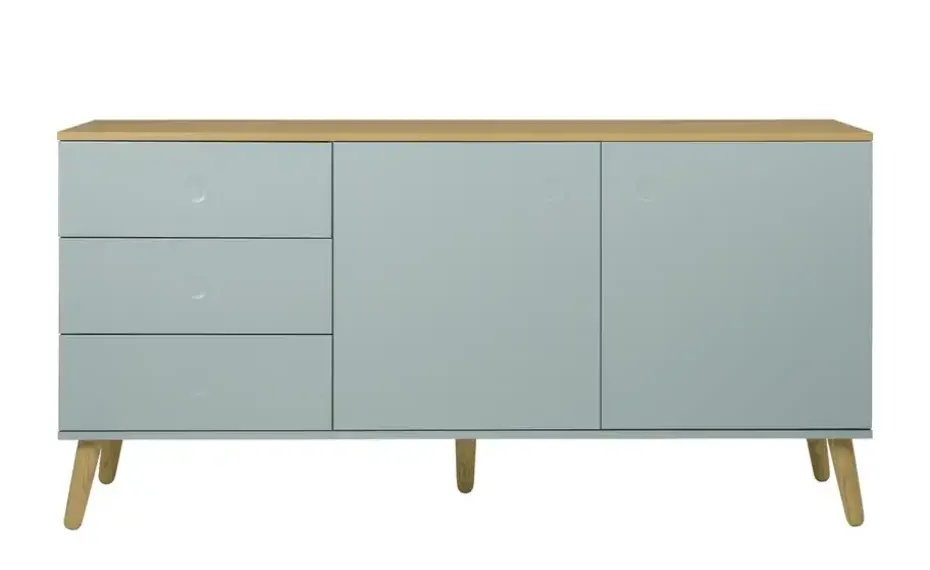 Das Sideboard Scan hat ein schlichtes skandinavisches Design mit Retro-Note. Abdeckplatte und Retrofüße im Eichen-Ton setzen sich vom angesagten Salbeigrün ab. Die Abdeckplatte ist mit Eichenholz furniert, die Beine aus massiver Eiche stehen leicht gespreizt ab. Scan hat drei Schubfächer und zwei Türen mit Stauraum dahinter. Türen und Schubkästen öffnen sich durch Push-to-Open. Sie brauchen also nur leicht auf die jeweilige Vorderseite zu drücken und schon geht die Tür auf. In Höhe des Druckpunktes ist die Oberfläche leicht abgeflacht. Ein zusätzliches, optisches Highlight.
