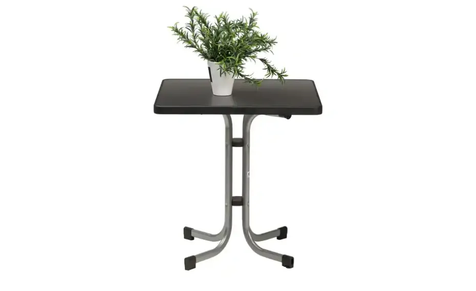 Der Klapptisch Mecalit-Pro besitzt eine quadratische Dekorplatte in anthrazitfarbener Schieferoptik mit abgerundeten Kanten. Schwungvoll ausladende metallene Beine in mattem Glanz stützen den kleinen Gartentisch. Dank seiner geringen Maße passt er auch gut auf kleinere Balkone oder Terrassen. Eine zusätzliche Vorrichtung an den Füßen macht es Ihnen möglich, den Tisch in seiner Höhe zu verstellen und somit Unebenheiten auszugleichen. Einen weiteren Vorteil bietet seine Klappfunktion, dank der Sie ihn einfach verstauen und transportieren können.