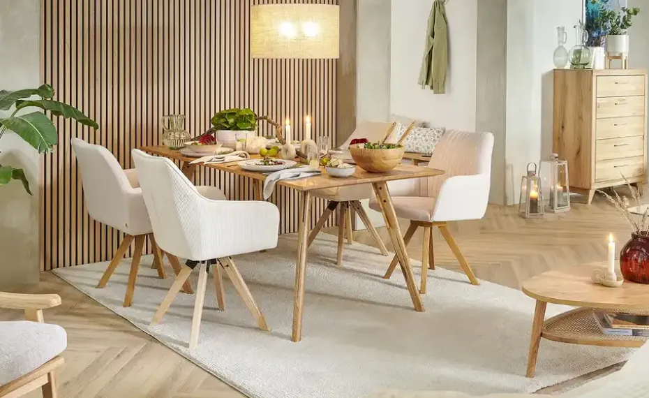 Dieser Armlehnstuhl verbindet Komfort, Funktion und Design. Der Sitzbereich ist mit einem weichen, pflegeleichten Veloursstoff bezogen, der an der Innenseite längs gesteppt ist. Das helle Massivholzgestell aus Eiche trägt den Stuhl zuverlässig. Außerdem ist eine praktische Drehfunktion integriert, die den Stuhl bei Nichtbenutzung sogar in die Ausgangsposition zurückbringt.