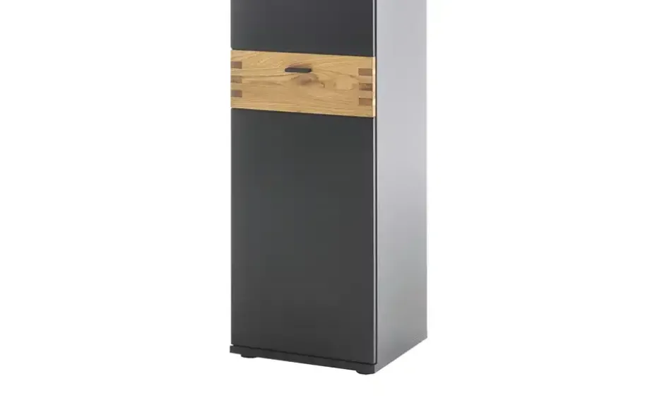 Front aus Holzwerkstoff lackiert in Schwarzgrau / Absetzung aus Massivholz in Wildeiche geölt mit durchgehender Lamelle