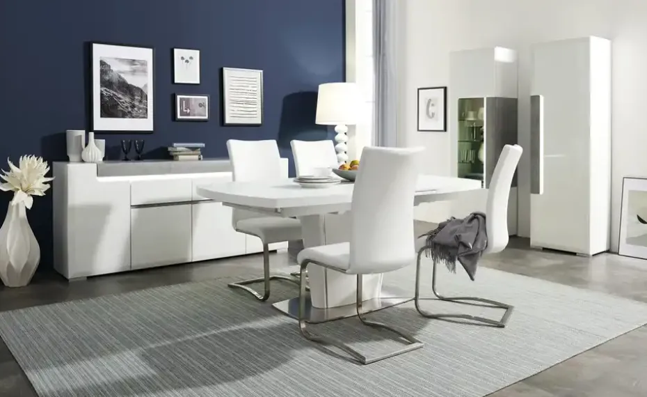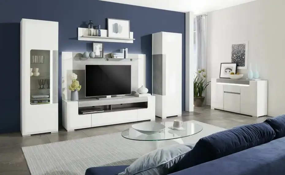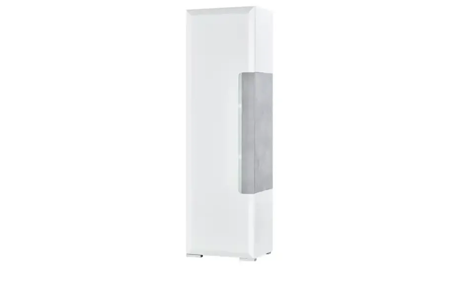 Der Name ist Programm: Das Stauraumelement Puro bietet Ihnen im Inneren viel Platz. Gleich fünf geräumige Fächer sind hinter der Tür zu finden. Doch auch optisch macht Puro etwas her. Die Absetzung in Beton (Nachbildung) zieht alle Blicke auf sich. Der Rest des Schrankes ist in Weiß bzw. Alpinweiß gehalten. Während die Front hochglänzend ist, wurde für den Korpus ein mattes Finish gewählt. Seitlich von der Beton-Optik befindet sich eine LED-Lichtleiste. Sie inszeniert das Stauraumelement auch bei Dunkelheit.