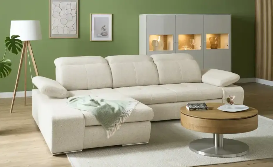 Mit dem Ecksofa Avilla schaffen Sie sich ganz leicht Ihre eigene Wohlfühl-Oase. Dicke Polster und einladende Arm- und Rückenlehnen sorgen für den nötigen Komfort. Verstellen Sie die Kopfteile und klappen Sie die Armlehnen kinderleicht hoch: Avilla passt sich Ihren Bedürfnissen problemlos an. Die gesamte Couch ist mit einem edlen, weichen Mikrofaserstoff in Veloursoptik bezogen und besitzt chromfarbene Füße, die einen attraktiven Kontrast setzten. Übrigens: Wählen Sie die erweiterte Funktion, wenn Sie häufiger Übernachtungsgäste empfangen. Avilla ist dann zusätzlich mit einem geräumigen Bettkasten und einer praktischen Schlaffunktion ausgestattet.