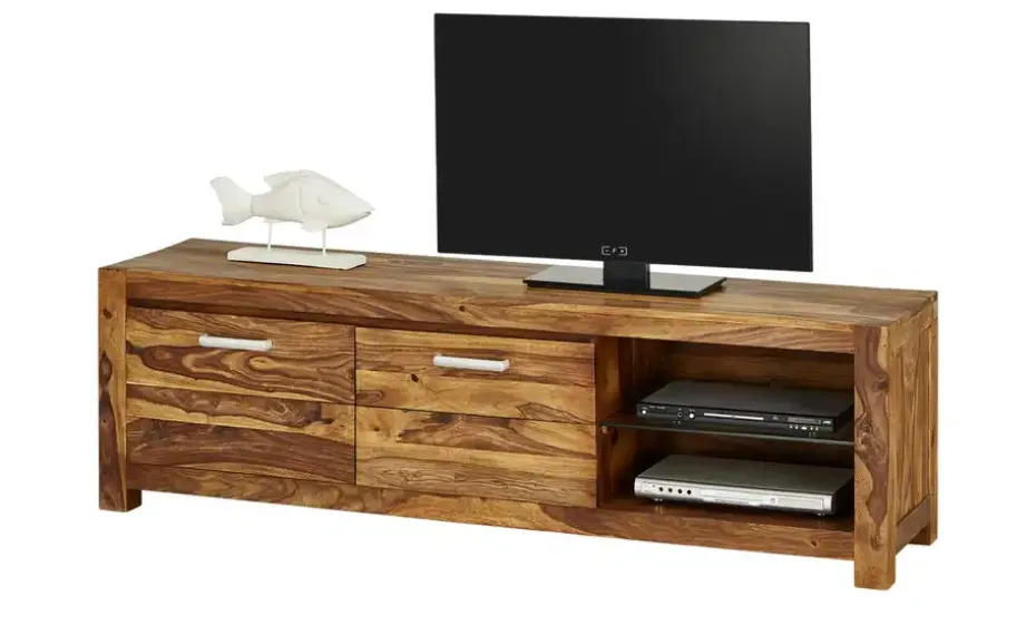 Das TV-Lowboard Amarillo ist aus schön gemasertem Sheesham-Holz gefertigt und damit ein absolutes Unikat. Mit seinen 180 Zentimetern Stellfläche eignet es sich für Fernsehgeräte und Monitore für bis zu 75 Zoll. Nutzen Sie den blickdichten Stauraum hinter den zwei Türen für loses Zubehör oder Magazine. In den beiden offenen Fächern finden zum Beispiel Konsolen oder andere Abspielgeräte Platz. Übrigens: Sie können die hellen Metallgriffe durch separat erhältliche, dunkle Metallgriffe austauschen. So verändern Sie das Aussehen des Lowboards mit nur wenigen Handgriffen.