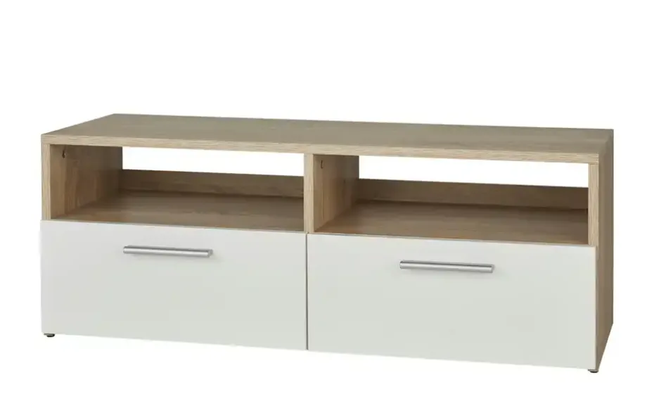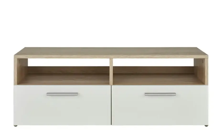 Auf dem TV-Lowboard Rana kann Ihr Fernseher wunderbar stehen. Unter der Stellfläche befinden sich zwei offene Gerätefächer. Stauraum ist hinter den beiden Klappen vorhanden. Rana hat einen Korpus in Eiche Sonoma (Nachbildung), die Front setzt sich in Weiß ab.