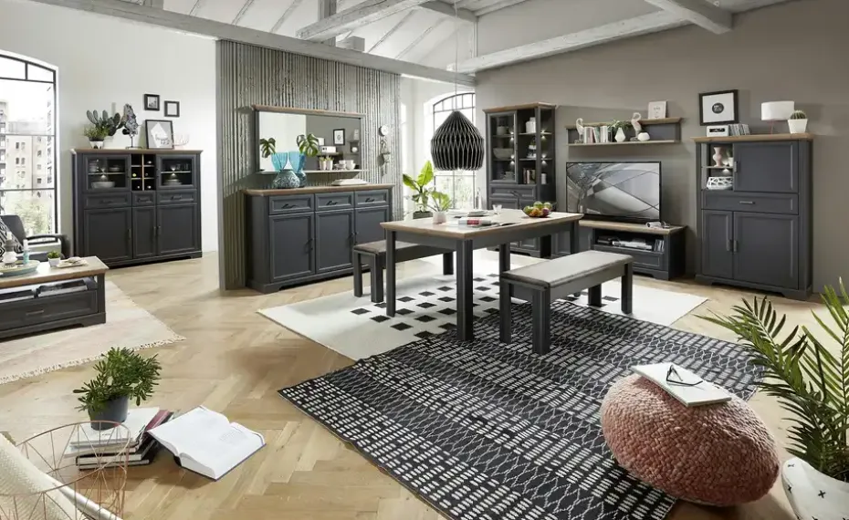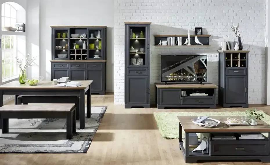 Präsentieren Sie Ihren Fernseher auf dem TV-Lowboard Varese. Es ist im Landhausstil designt und hat eine attraktive graphitgraue Farbe im Mix mit Asteiche (Nachbildung). Varese kann mit bis zu 40 kg belastet werden und kann TV-Geräte bis zu 60 Zoll Größe tragen. Unterhalb der Stellfläche befindet sich ein Gerätefach mit Kabeldurchlass. Das Lowboard ist zudem mit einer Tür und einer Schublade ausgestattet, die beide über eine Soft-Close-Ausstattung verfügen.