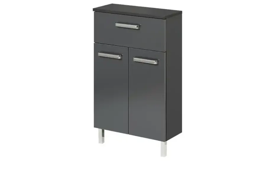 Griffe und Füße in Chromoptik setzen Akzente an diesem anthrazitfarbenen Unterschrank. Er hat zwei Türen mit zwei Fächern dahinter. Direkt darüber befindet sich eine Schublade.
