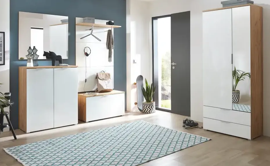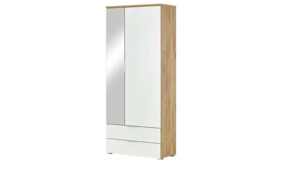 Mehr Stauraum im Flur, den gibt es mit dem Dielenschrank Bent von uno. Im Schrankinneren stehen Ihnen sechs Fächer und eine Kleiderstange zur Verfügung. Unterhalb der beiden Türen gibt es zudem zwei große Schubfächer. Praktisch: Die linke Schranktür verfügt über einen großen Spiegel. Bent sieht auch attraktiv aus: Der Korpus in Navarra Eiche (Nachbildung) wird von der weißen Front abgesetzt.
