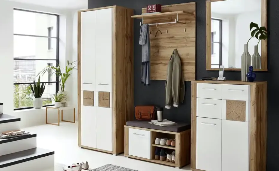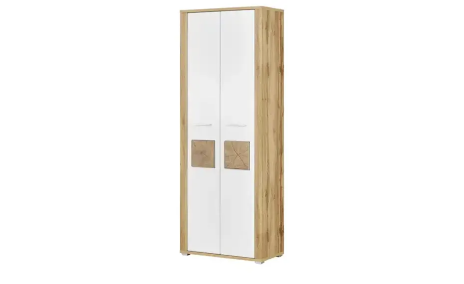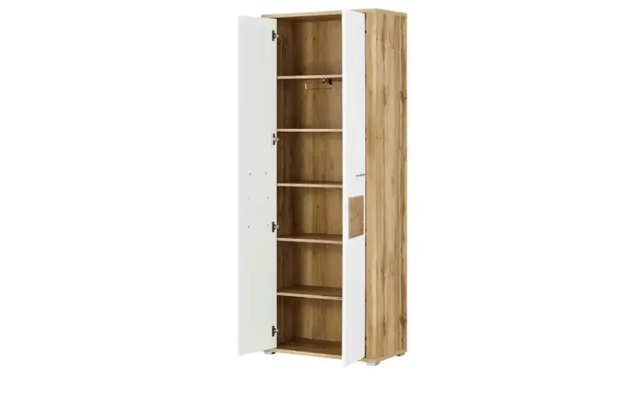 Gerade der Flur sollte ordentlich sein. Schließlich ist er das erste was Sie sehen, wenn Sie zur Tür hereinkommen. Mit dem Dielenschrank Yambio von uno können Sie wunderbar Ordnung schaffen. Das Beste daran: Das Schrankinnere können Sie ganz nach Bedarf aufteilen. Der Schrank wird mit fünf Einlegeböden und einer Kleiderstange geliefert. Nutzen Sie die Böden, um darauf Schuhe abzustellen. Jacken und Mäntel werden an der Kleiderstange aufgehängt. Sie ist ausziehbar. Der Schrankkorpus hat ein Dekor in Eiche Altholz (Nachbildung). Die Front setzt sich in Weiß ab. Auf beiden Türen befinden sich Absetzungen in Hirnholzoptik.