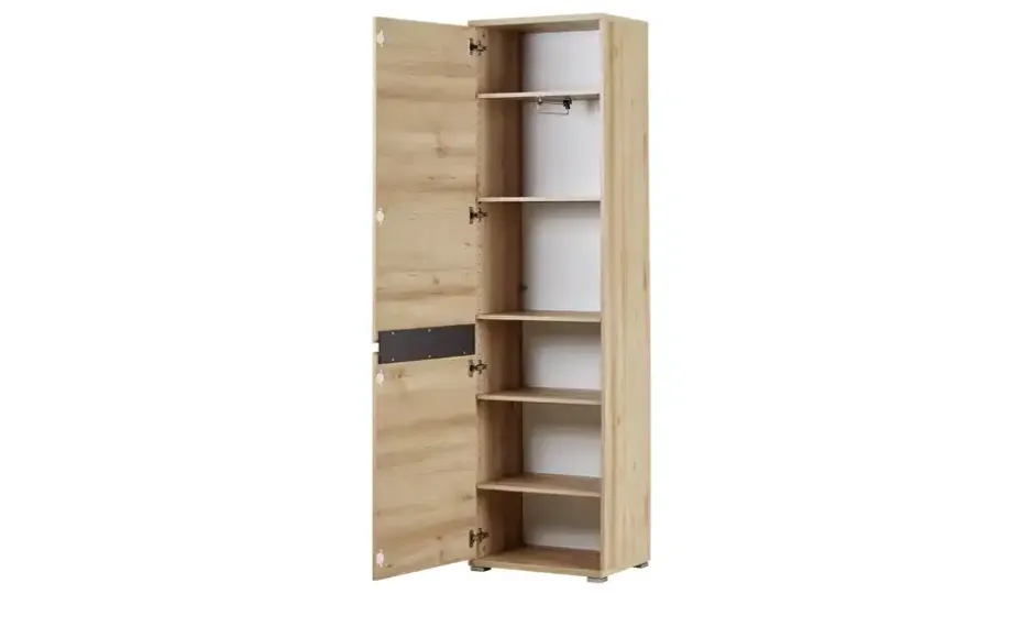 Mit dem Dielenschrank LENNOX schaffen Sie Stauraum im Flur. Der Schrank bietet Ihnen viel Platz für Jacken, Schuhe und andere Dinge. Im Inneren ist der Schrank mit fünf Böden und einer Kleiderstange ausgestattet. Die Kleiderstange lässt sich ausziehen, um Ihnen das Aufhängen der Mäntel zu erleichtern. Da die Einlegeböden in der Höhe verstellbar sind, können Sie die Größe der Fächer ganz nach Belieben regulieren. Mittig finden Sie eine Absetzung in Grau, die den verdeckten Gehrungsgriff absetzt.