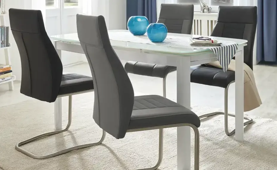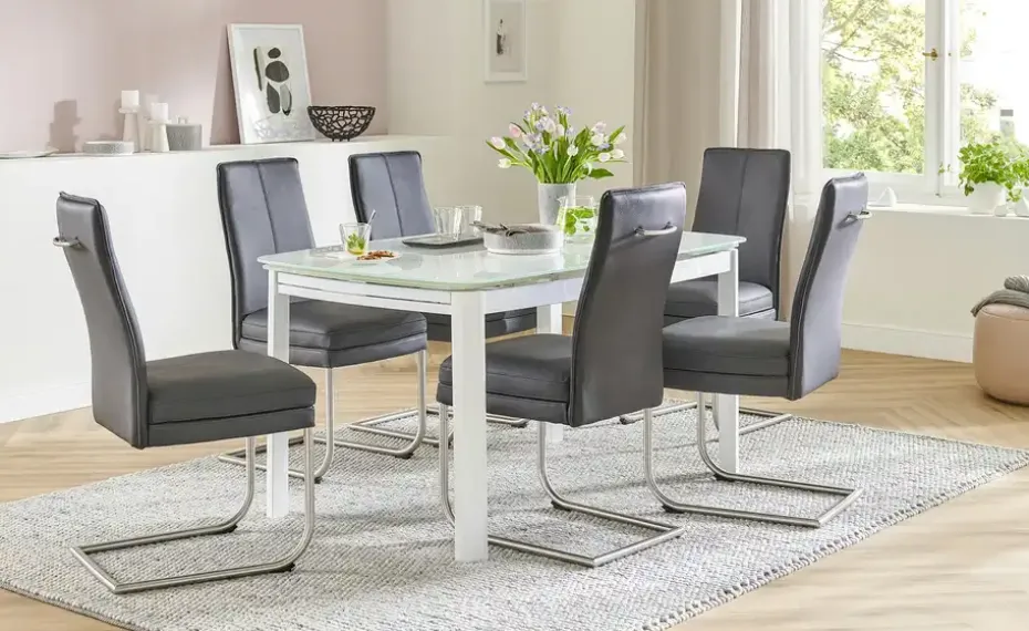 Für Liebhaber heller Einrichtungen bestens geeignet: Dieser Esstisch kombiniert eine superweisse Glasplatte mit einem weißen hochglänzenden Gestell. Dank zweier Vorkopfauszüge vergrößern Sie völlig unproblematisch bei Bedarf einfach die Tischfläche, wenn sich beispielsweise Besuch zum Abendessen ankündigt oder eine Familienfeier ansteht.