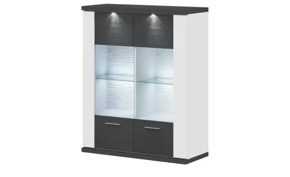 Die Serie Titan von uno überzeugt mit elegantem Kontrastdesign. Teil der Serie ist diese Hängevitrine. Sie ist in Weiß und Graphit (Nachbildung) designt. Die graphitfarbigen Frontabsetzungen haben eine geriffelte Oberfläche und werden von den weißen Hochglanzflächen eingerahmt. Damit die attraktive Optik noch besser zur Geltung kommt, wird Titan mit einer LED-Beleuchtung für die Front geliefert. Hinter den beiden Drehtüren befindet sich Stauraum in acht Fächern. Vier davon sind durch das Glas in den Türen einsehbar. Perfekt, um Deko oder Geschirr zu präsentieren.