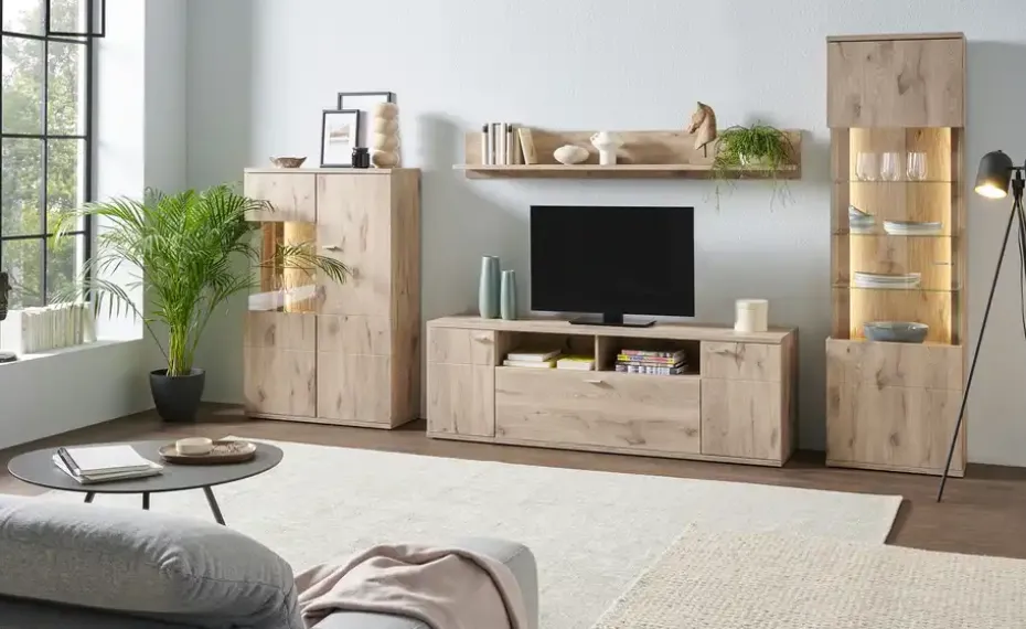 Korpus und Front aus Holzwerkstoff in Viking Oak tiefgezogen (Nachbildung)) / sichtbare Rückwand in Viking Oak geschroppt (Nachbildung)
