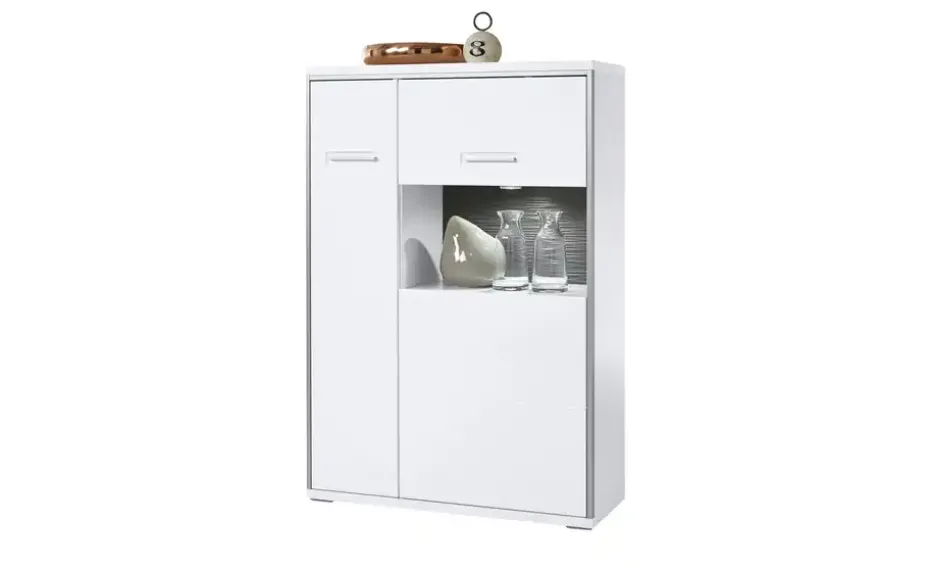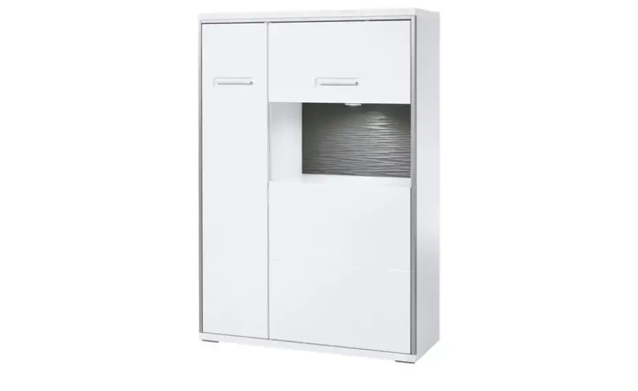 Viel Stellfläche hinter zwei Türen und ein geräumiges Vitrinenfach bietet Ihnen das Highboard Setto. Ein Eyecatcher ist die Rückwand der Vitrine. Sie ist grau und hat eine auffällige geriffelte 3D-Optik. Damit setzt sie sich vom freundlichen, puristischen Weiß des Highboards ab. Akzente werden durch die hochglänzende Front, den Metallrahmen im Edelstahllook und die beiden vertieften Metallgriffe gesetzt. Das Highboard passt wunderbar zu den anderen Möbeln der Serie Setto.