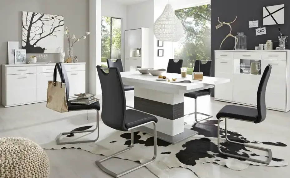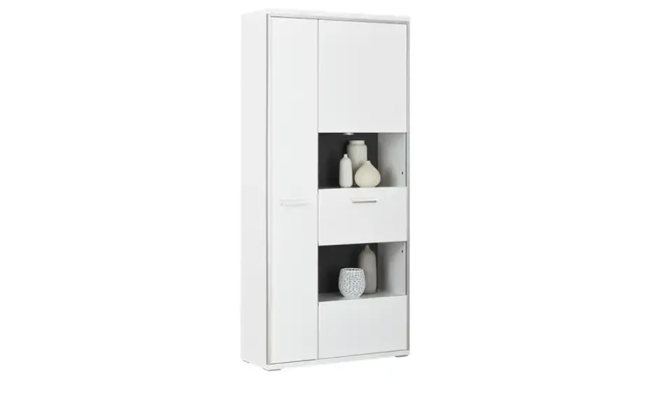 Gradliniges Design, puristisches Weiß und Akzente aus Metall – Setto ist eine tolle Kombi-Vitrine für Speisezimmer oder Wohnraum. Hinter den beiden Türen verbirgt sich ein praktisch ungeteilter Stauraum, den Sie je nach Bedarf nutzen können. Zusätzlich stehen Ihnen zwei Vitrinenfächer zur Verfügung. Diese fallen durch ihre grau abgesetzten Rückwände in 3D-Optik auf. Der Grauton stellt einen auffälligen Kontrast zum Weiß des Möbelstückes dar.