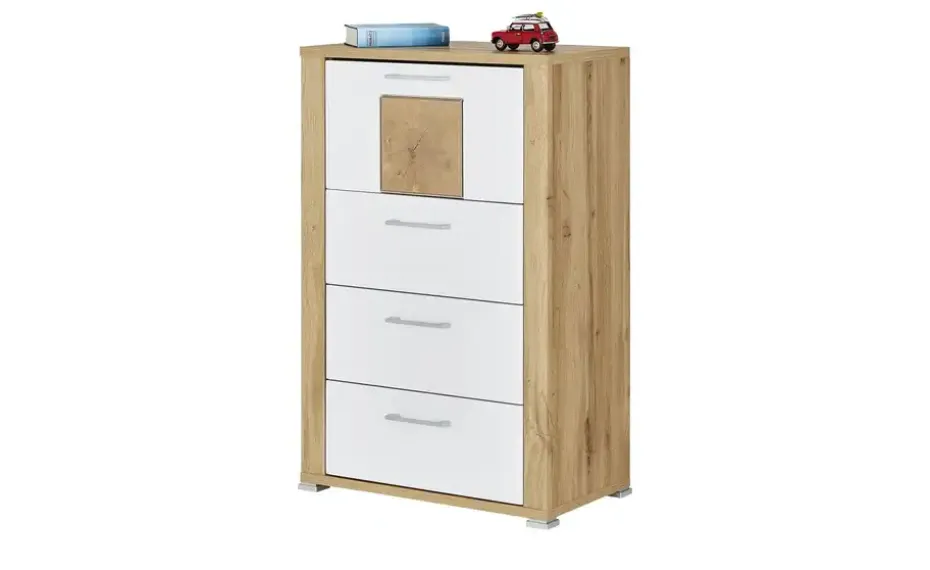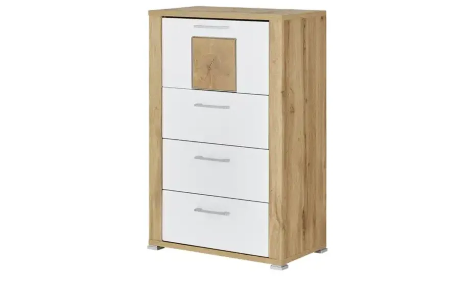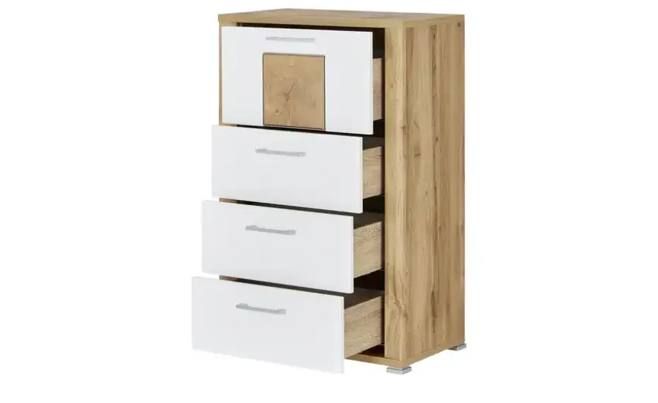Modernes Design lässt sich wunderbar mit natürlichen Akzenten kombinieren. So wie bei der Kommode Yambio von uno. Die geradlinige Linienführung und weiße Front wirken modern, während sich der Korpus in rustikaler Eiche Altholz (Nachbildung) absetzt. Ein besonders interessanter Eyecatcher ist die Frontabsetzung in Hirnholz (Nachbildung). Sie greift die Optik eines aufgeschnittenen Baumstammes auf, bei der Sie die Jahresringe erkennen können. Yambio ist mit vier Schubladen ausgestattet. Alle vier verfügen über einen sanft schließenden Selbsteinzug.