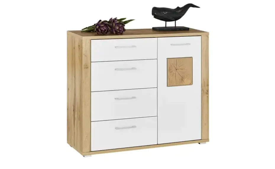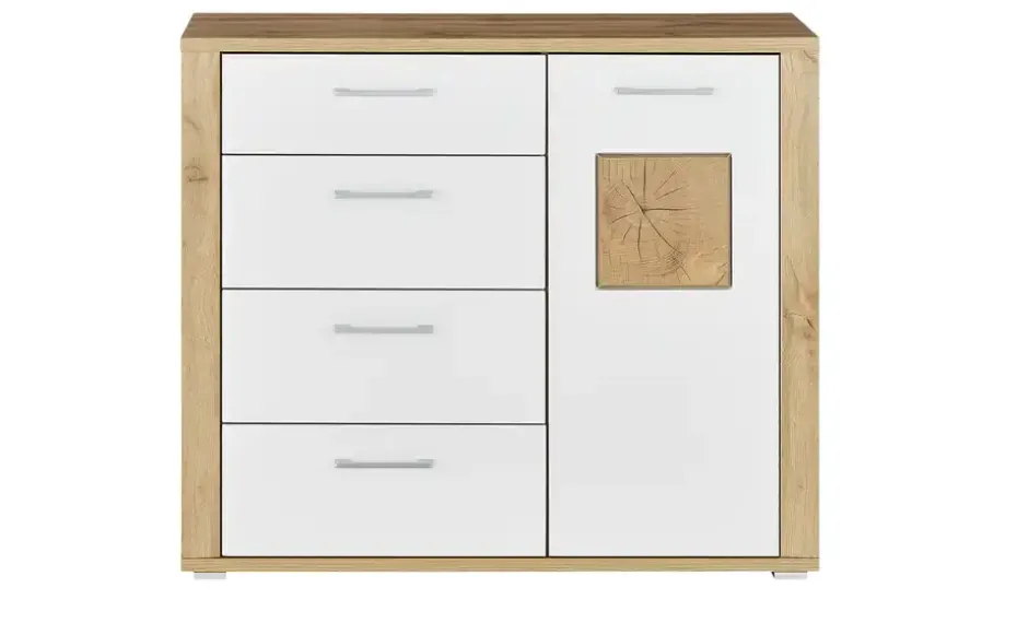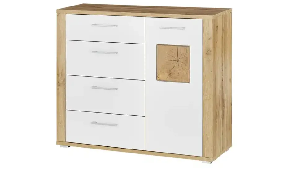 Modernes Design lässt sich wunderbar mit natürlichen Akzenten kombinieren. So wie bei der Kommode Yambio von uno. Die geradlinige Linienführung und weiße Front wirken modern, während sich der Korpus in rustikaler Eiche Altholz (Nachbildung) absetzt. Ein besonders interessanter Eyecatcher ist die Frontabsetzung in Hirnholz (Nachbildung). Sie greift die Optik eines aufgeschnittenen Baumstammes auf, bei der Sie die Jahresringe erkennen können. Yambio ist mit vier Schubladen und einer Tür ausgestattet. Alle vier Schübe verfügen über einen sanft schließenden Selbsteinzug, die Tür ist mit einer Soft-Close-Ausstattung versehen.