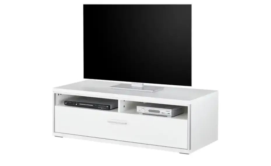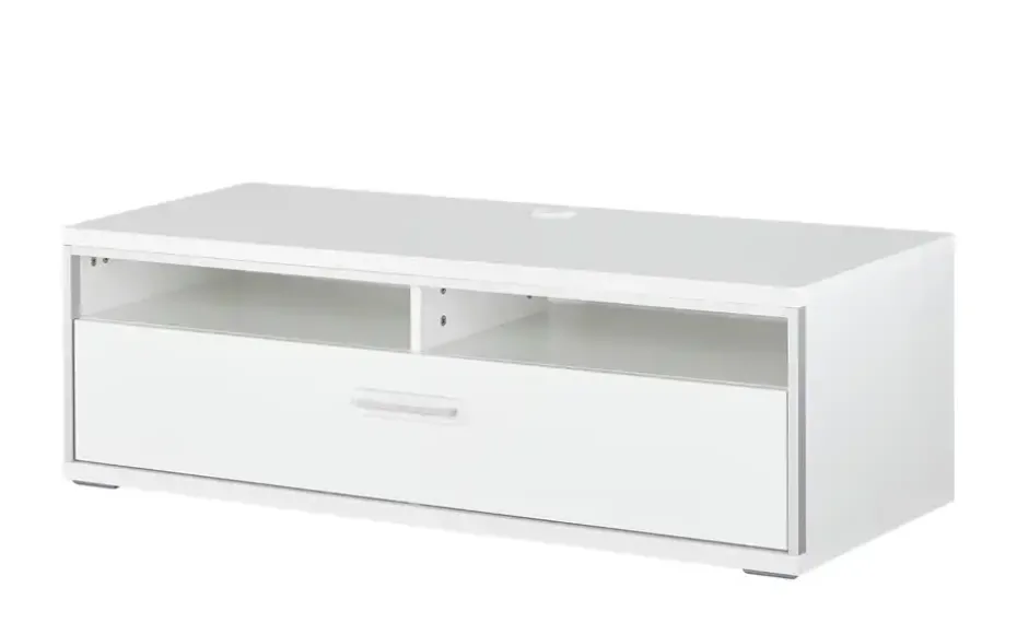 Für Ihren Fernseher und DVD-Player passend ist das TV-Element Setto. Während der TV oben auf dem Lowboard abgestellt wird, passen andere Geräte in die geräumigen offenen Fächer. Dank der Kabeldurchführung in der Rückwand wird nervigem Kabelsalat vorgebeugt. Unterhalb der beiden offenen Fächer befindet sich ein großer Schubkasten. Setto ist schlicht designt. Die weiße Farbe wird durch Metallakzente abgesetzt. Die Vorderseite des Schubkastens ist hochglänzend.
