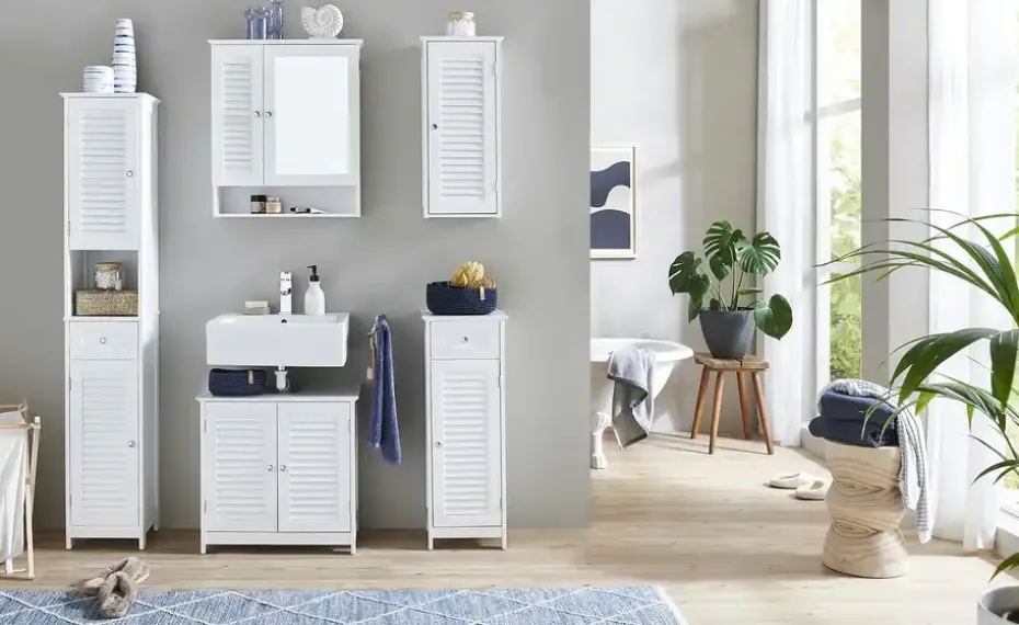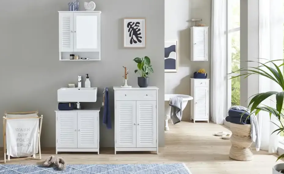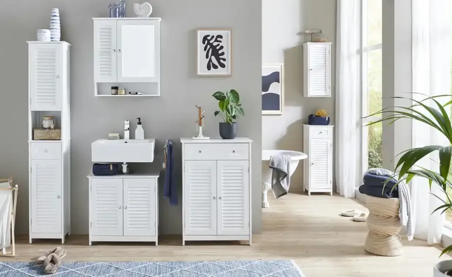 Mit dem Bad-Unterschrank Königsee schaffen Sie Ordnung im Badezimmer. Königsee verfügt über eine große Schublade und zwei Fächer hinter den Türen. Den Einlegeboden können Sie in der Höhe variieren. Ein Eyecatcher sind die Türen in Lamellenoptik. Sie geben dem Landhausstil des Schrankes eine maritime Note.