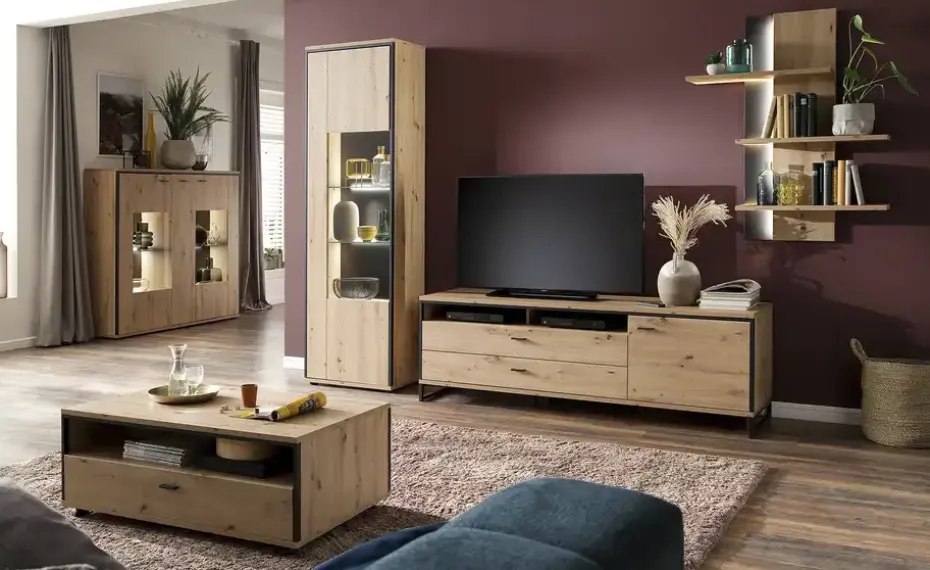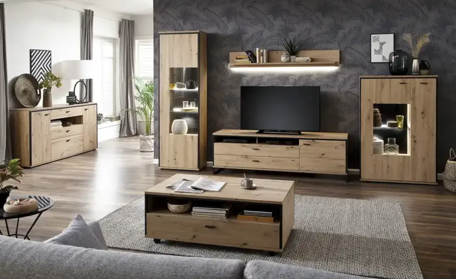 Korpus aus Holzwerkstoff melaminbeschichtet in Balkeneiche (Nachbildung) / Absetzung aus Metall in Anthrazit