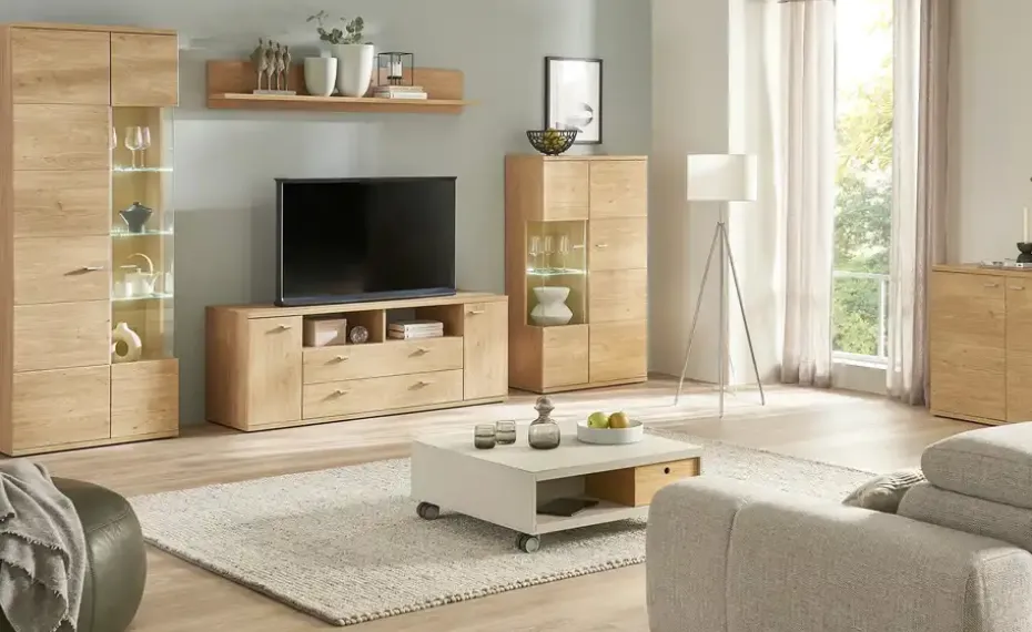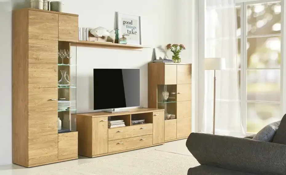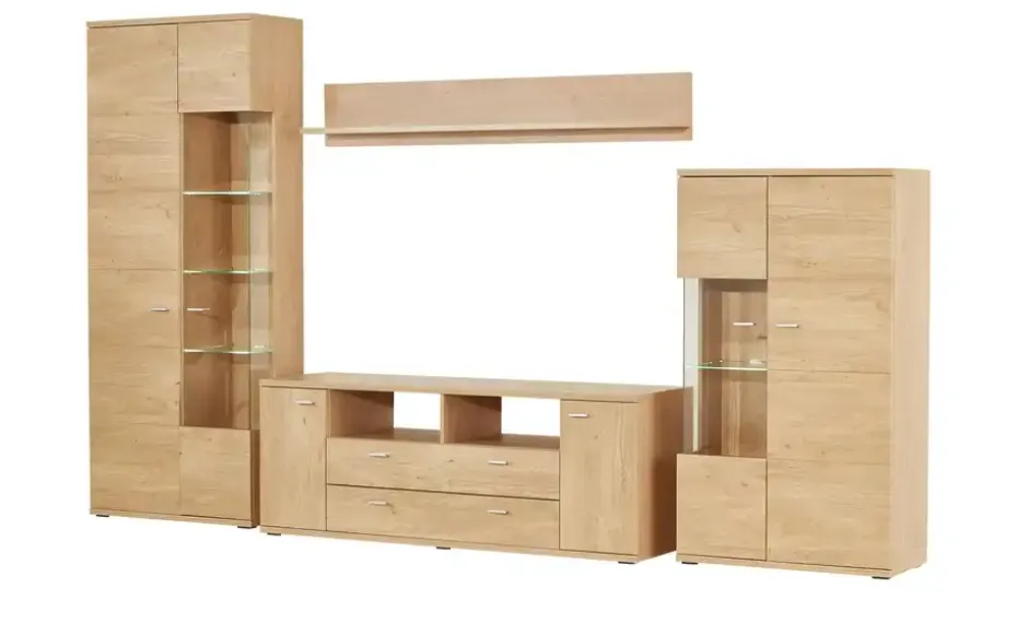 Die holzfarbene Wohnkombination Oregon schafft eine freundliche und gemütliche Atmosphäre in Ihrem Wohnzimmer. Die Wohnwand besteht aus einer mittelgroßen und einer großen Standvitrine, einem TV-Schränkchen und einem Wandboard. Die Möbelstücke bieten sowohl wertvollen Stauraum als auch Platz, um Lieblingsstücke zu präsentieren. Im Lieferumfang enthalten ist auch eine Glaskantenbeleuchtung. Diese setzt die Wohnwand im Dunklen optimal in Szene.