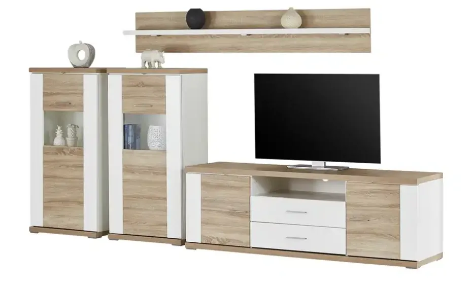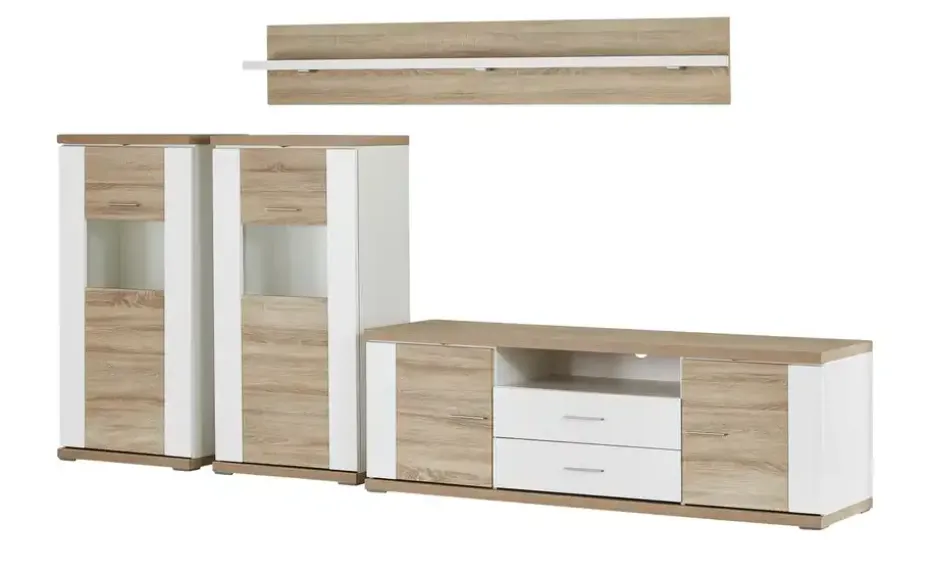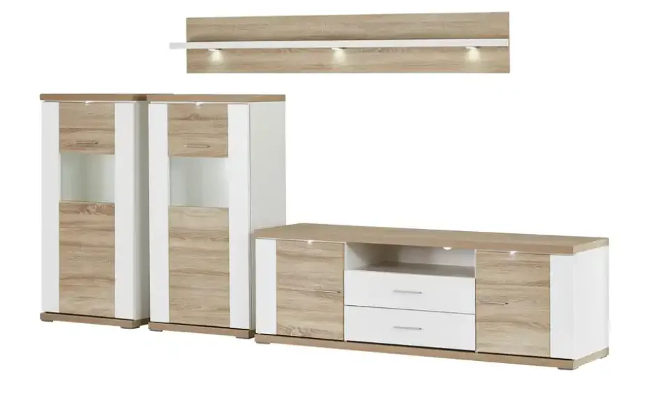 Weiß und helle Holzdekore sehen toll zusammen aus. So wie bei der Wohnkombination Titan von uno. Sie ist in Eiche sägerau (Nachbildung) und Weiß designt. Die weißen Fronten haben einen hübschen Hochglanz – ein Kontrast zu der geriffelten Front des Dekors. Durch die LED-Beleuchtung kommt die dekorative Frontoptik noch besser zur Geltung. Zu der Kombi gehören zwei Vitrinen, ein TV-Lowboard und ein passendes Wandpaneel. Die diversen Elemente bieten Stauraum und freie Ablageflächen. In den Vitrinen können Sie Ihre Lieblingstücke präsentieren.