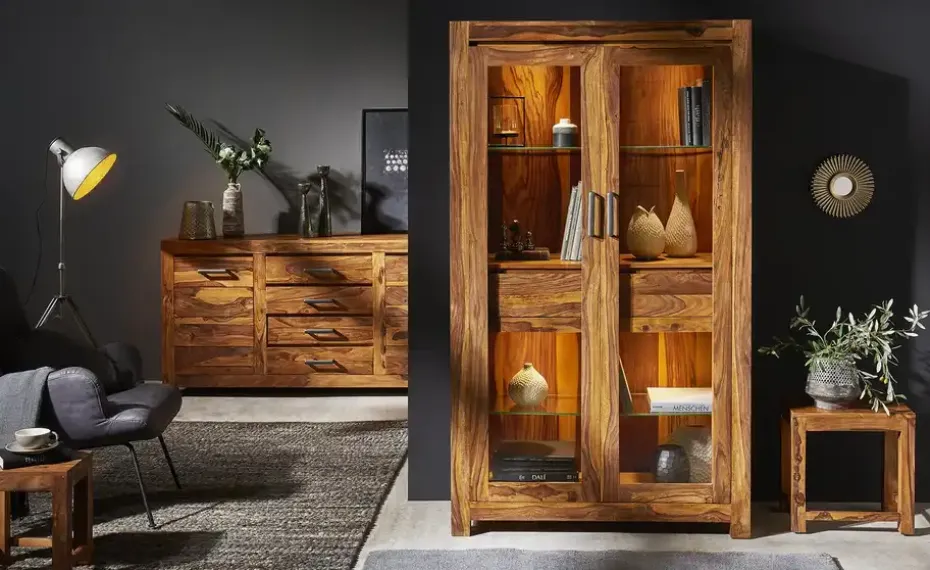 Einzigartige Struktur- und Farbverläufe zeichnen Sheesham-Holz aus. Das honigbraune, besonders gemaserte Holz findet sich in der gesamten Amarillo-Serie und macht jedes Möbelstück zu einem Unikat. Bei der Vitrine Amarillo wird das Naturmaterial mit Metall und Glas kombiniert. Setzen Sie Ihre Lieblingsstücke oder besonders dekorative Pieces hinter den beiden Vitrinentüren in Szene. Insgesamt acht einsehbare Fächer stehen Ihnen zur Präsentation zur Verfügung. Blickdichten Stauraum finden Sie dagegen in den zwei Schubfächern. Übrigens: Die hellen Metallgriffe können Sie bei Bedarf ganz einfach durch separat erhältliche, anthrazitfarbene Griffe austauschen.