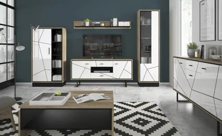 Das geometrische Frontdesign macht die Vitrine Arezzo zum Eyecatcher. Die weiße, glänzende Front wird von matt-schwarzen Fugen unterbrochen. Ein Teil der Front wird außerdem von Klarglas abgesetzt, so dass Sie in die dahinterliegenden Fächer sehen können. Zwei weitere Fächer im unteren Bereich der Vitrine werden durch die Tür verdeckt. Die große Drehtür selbst ist mit einer Soft-Close-Ausstattung versehen und schließt deshalb leise.