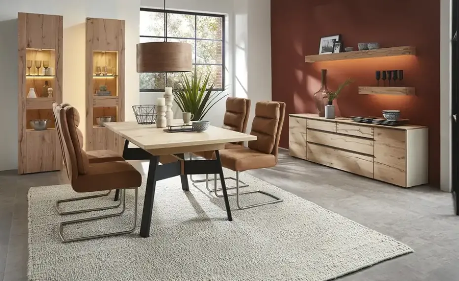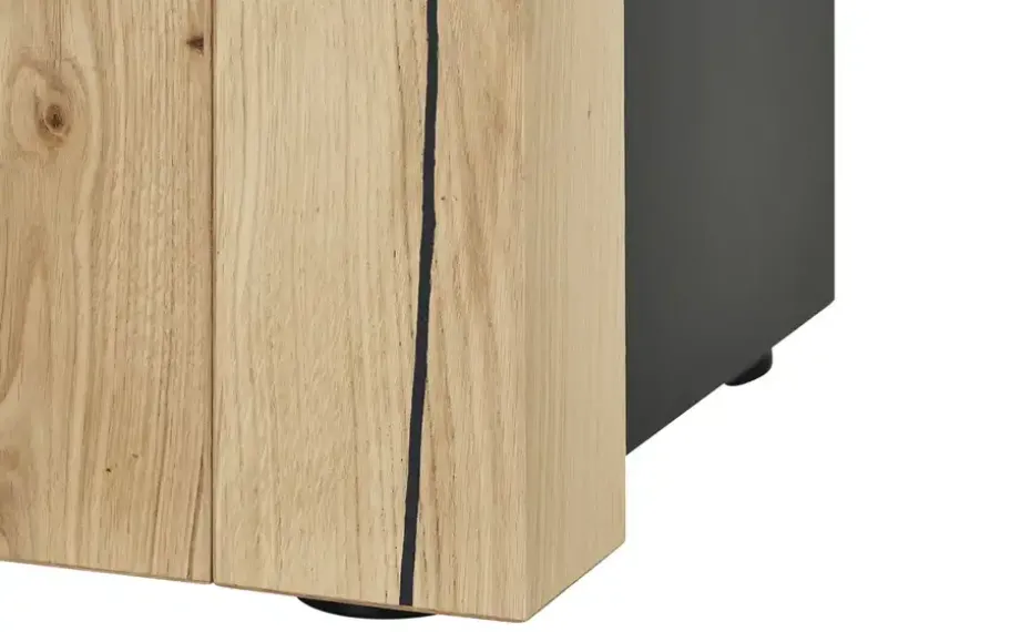 Die Vitrine Light Line 6 ist ein toller Ort zum Präsentieren von Porzellan oder Lieblingsstücken. Die drei geräumigen Vitrinenfächer sind durch die Glasabsetzung in der Tür gut einsehbar. Auch die beiden Einlegeböden zwischen den Vitrinenfächern sind aus Klarglas. Weiterer Stauraum befindet sich jeweils ober- und unterhalb der Vitrinenfächer. Der gesamte Korpus ist in mattem Schwarz lackiert. Ein auffälliger Kontrast zur Front in Asteiche, die mit dem edlen Holz furniert wurde. Das Furnier ist zusätzlich gebürstet worden, um ihm ein mattes Finish zu geben.