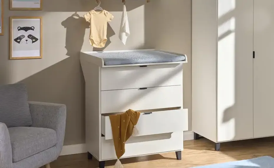 Diese Möbelserie ist perfekt für alle, die klare Linien und zeitloses Design schätzen. Dieser weiße Wickelaufsatz passt perfekt zur gleichnamigen Kommode der Serie. Er verwandelt sie in einen praktischen Wickeltisch für Ihren Nachwuchs.