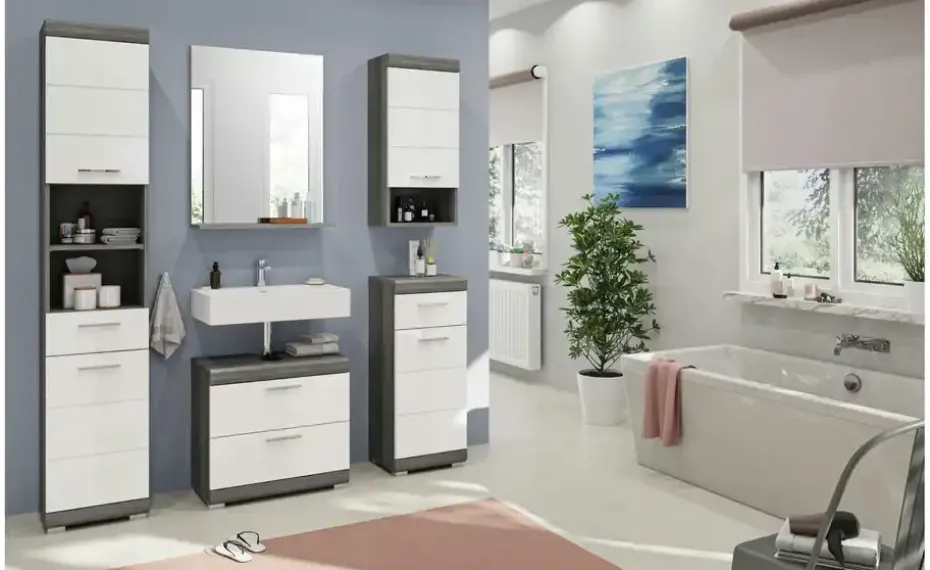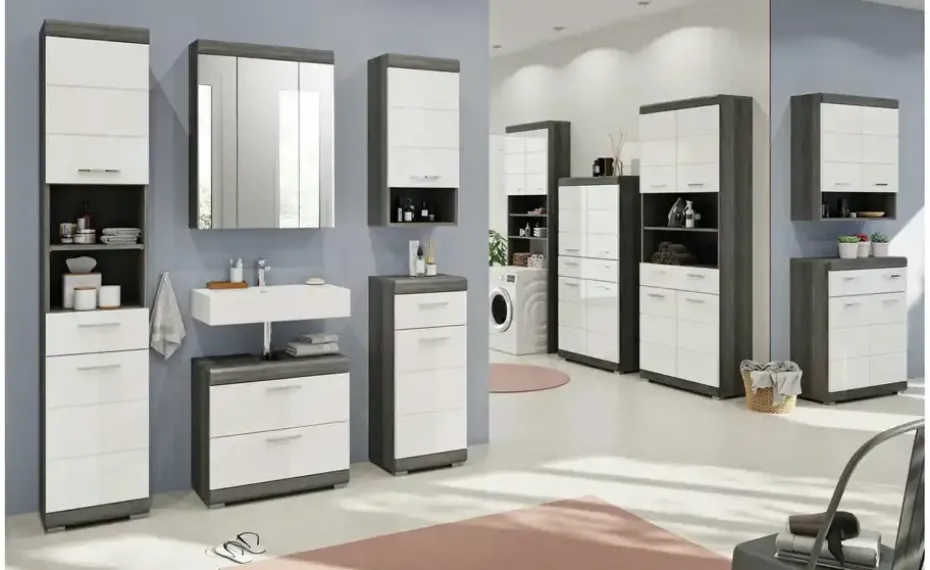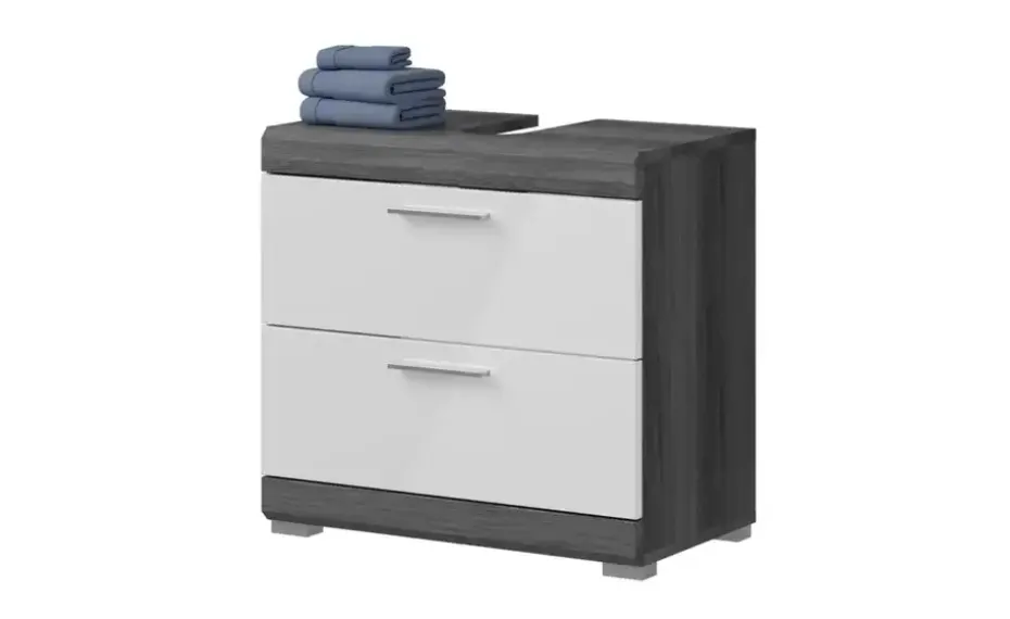 In unserem modernen Sortiment präsentieren wir einen Badezimmer Waschbeckenunterschrank in angesagter Rauchsilber Nachbildung und weißem Hochglanz tiefgezogenem Finish, der deinem Badezimmer einen modernen Look verleiht. Mit kompakten Maßen von 60x56x34 cm bietet er nicht nur praktischen Stauraum, sondern auch ein stilvolles Design. Entdecke die perfekte Kombination aus Funktionalität und trendigem Chic mit diesem angesagten Waschbeckenunterschrank.