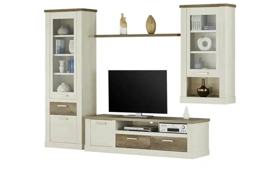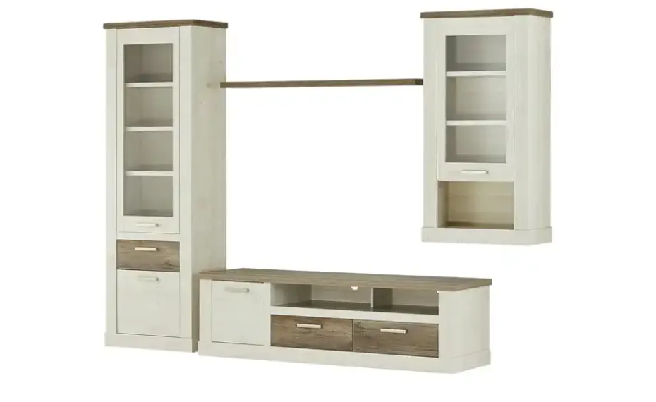 Dass der Landhausstil auch geradlinig und modern sein kann, das beweist die Wohnkombination Viareggio. Ihre helle Pinie Weiß (Nachbildung) mit Highlights in Eiche Antik (Nachbildung) abgesetzt. Zu der Kombination gehören vier Elemente: eine Stand- und eine Hängevitrine, ein TV-Element und das passende Wandboard. Sie können die einzelnen Elemente der Kombination nach Belieben im Wohnraum platzieren. Sie bieten geschlossenen Stauraum und freie Stellflächen. In den Vitrinenfächern können Sie Geschirr oder Deko hinter Glas präsentieren.