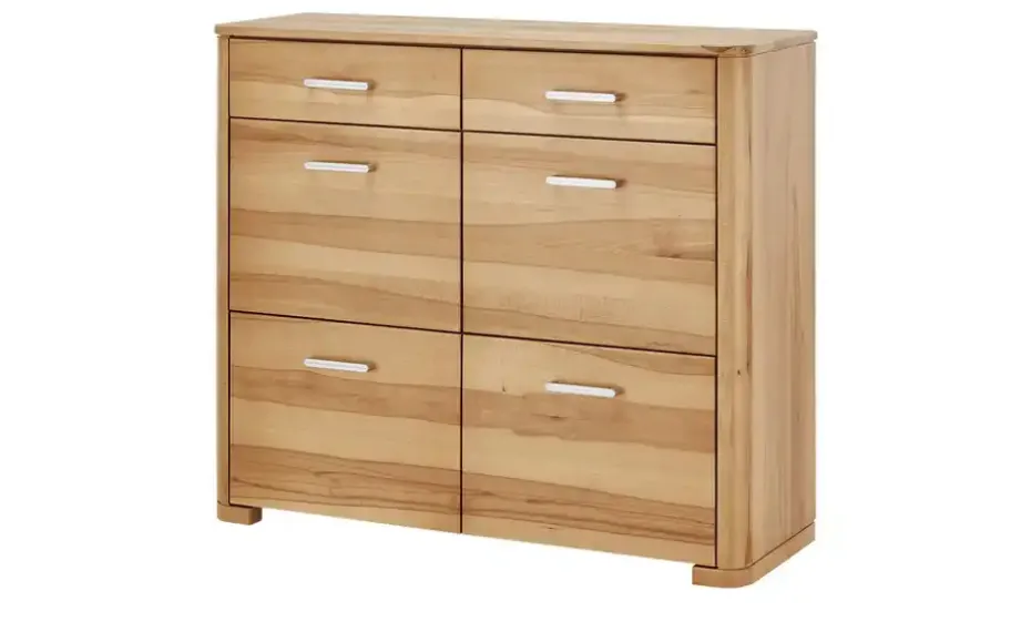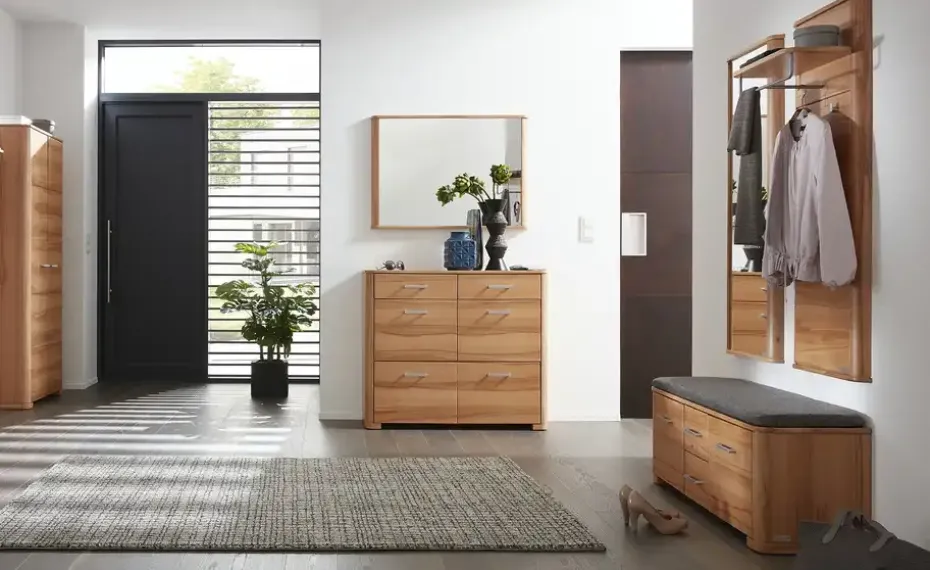Welche Schuhe Sie auch mögen, sie alle passen in den Schuhschrank Atrio von Wohnwert. Er ist mit vier Klappen und jeweils zwei Fächern dahinter ausgestattet. Hier können Sie etwa 16 Paare unterbringen. Alle vier Klappen sind mit einer Dämpfung ausgestattet. Deshalb schließen sie sanft und geräuscharm. Zusätzlicher Stauraum ist in den beiden Schubladen zu finden. Atrio ist aus hochwertiger Kernbuche gefertigt und exzellent verarbeitet. Der Korpus ist furniert, für die Front ist Massivholz verwendet worden. Die Oberflächen sind zum Schutz mit Lack behandelt.