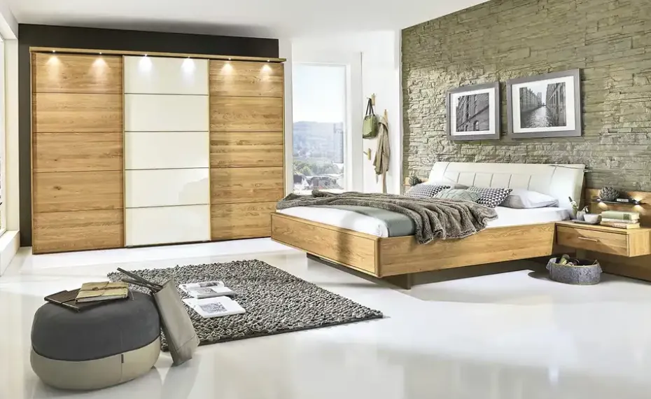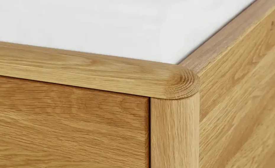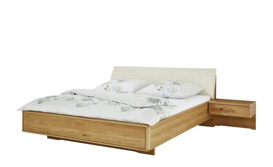 Die Bettanlage Kyran wird inklusive Nachtkonsolen geliefert. Bettgestell und Nachtschränke sind aus massiver Eiche gefertigt. Das Kopfteil des Bettes ist weich gepolstert und mit Kunstleder bezogen. Der helle Magnolie-Ton passt gut zum Holzdekor. Für praktischen Stauraum sorgen die beiden Schubkästen. Je einer befindet sich in den beiden Nachtkonsolen.
