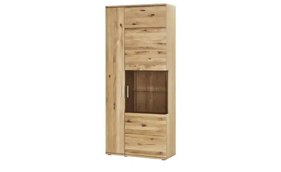 Stauraum und Vitrine in einem – das ist die Kombivitrine Astoria von Woodford. In den beiden Vitrinenfächern ist Platz für Porzellan oder anderes dekoratives Geschirr. Darüber hinaus bietet Astoria viel Platz für all die Dinge, die Sie unterbringen möchten. Ihnen stehen 12 Fächer in unterschiedlichen Größen zur Verfügung. Die Kombivitrine besteht aus Asteiche Bianco – als Massivholz und Furnier. Der rustikale Look entsteht durch die Strukturunterschiede und die diversen Asteinschlüsse. Sie sind typisch für diese Holzart.