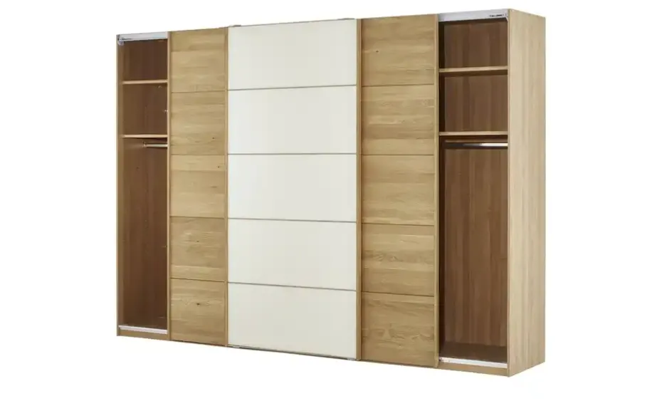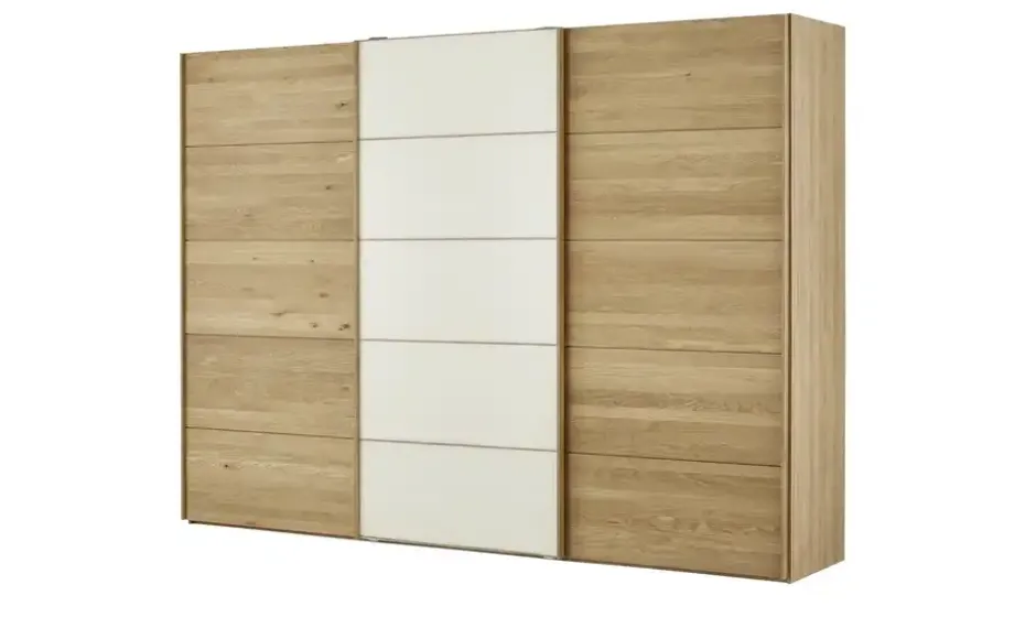 Kyran ist ein edler, hochwertig verarbeiteter Schrank der Marke Woodford. Er bietet Qualität Made in Germany und ist unter anderem mit dem Goldenen M ausgezeichnet worden. Die Front besteht aus drei Schwebetüren, die seitlich aufgleiten. Die beiden äußeren Türen sind aus massiver Eiche Natur gefertigt. Die mittlere Tür hat eine Oberfläche aus edlem Farbglas in einem eleganten hellen Cremeton. Ein schöner Kontrast zum Holz bzw. der Holzoptik des Korpus. Das Schrankinnere unterteilt sich in drei Elemente. Je Element stehen Ihnen zwei Böden und eine Kleiderstange zur Verfügung. Ideal also für Ihre Kleidung.