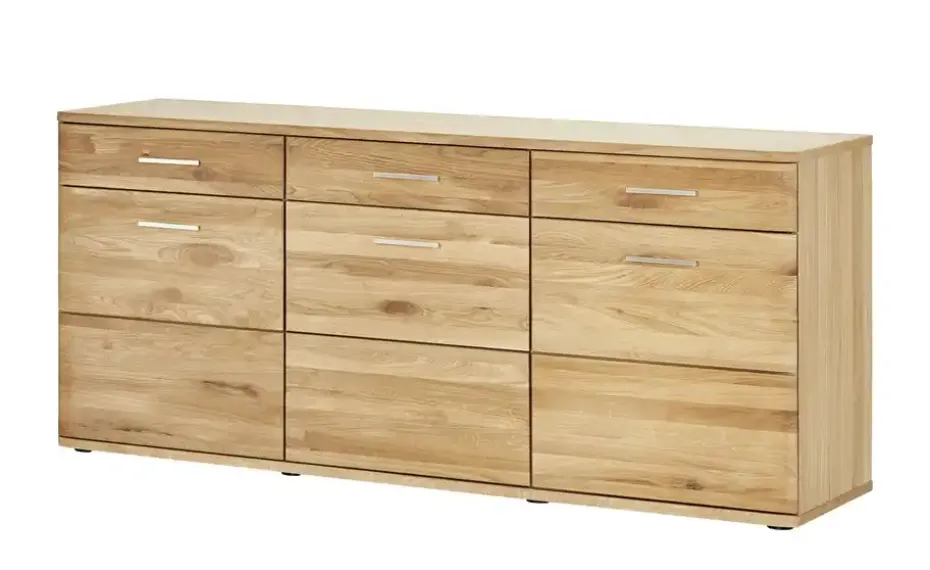 Asteinschlüsse und eine auffällige Struktur machen das Sideboard Astoria von Woodford zum Eyecatcher. Die Front besteht aus massiver Asteiche Bianco. Für den Korpus ist ein Asteichen-Furnier verwendet worden. Ein Öl schützt das Holz. Sie können das Sideboard zum Unterbringen von Tellern, Besteck und Tischwäsche nutzen. Astoria bietet Ihnen drei Schubladen und drei Türen. Hinter jeder der drei Türen gibt es jeweils zwei Fächer. Die Türen schließen dank eines Türdämpfers leise.
