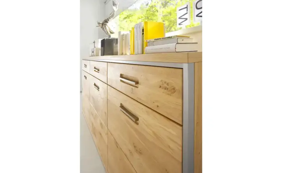 Mit dem geräumigen Sideboard Felino erwerben Sie ein vielseitiges Möbelstück, in dem Sie Bücher, Akten und vieles mehr sicher und ordentlich aufbewahren können. Dafür stehen Ihnen gleich mehrere Fächer zur Verfügung, die sich hinter Türen verbergen. Im oberen Bereich können Sie darüber hinaus drei Schubfächer nutzen. Auch die Oberseite des Möbels kann Ihnen als zusätzliche Ablagefläche dienen. Das Design der Kommode wird durch einen matten Rahmen in Edelstahloptik und eben solche Griffe gekonnt abgerundet. Letztere ermöglichen Ihnen ein komfortableres Öffnen der Türen und Schubfächer.
