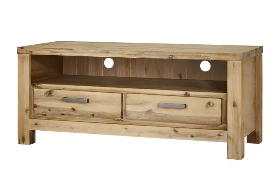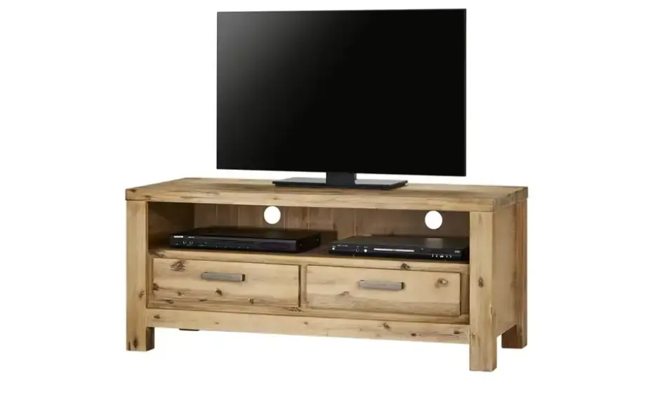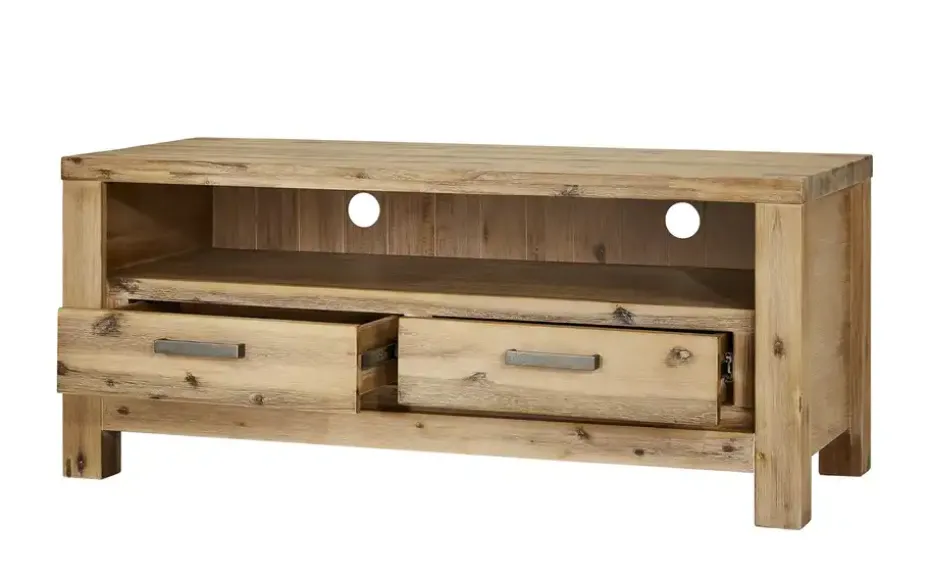 Der TV-Unterschrank Borneo ist nicht nur praktisch, sondern gibt Ihrem Wohnraum auch eine rustikale Note. Borneo ist aus Akazienholz gefertigt. Für den Rahmen und die Front wurde massive Akazie verwendet. Der Korpus ist hochwertig furniert. Der gesamte Schrank ist gebeizt und lackiert. Dabei ist ein schöner Sandton entstanden. Die natürliche Maserung ist dennoch erhalten geblieben und gibt dem TV-Schrank seine besondere Optik. Borneo verfügt über ein großes Gerätefach mit Kabeldurchführungen. Darunter befinden sich zwei geräumige Schubladen.