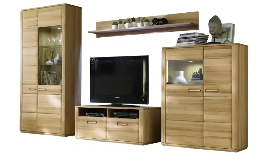 Wer hohe Qualität und ein natürliches Design bevorzugt, dem wird die Wohnkombination Dio gefallen. Die Fronten sind aus hochwertigem Kernbuchen-Massivholz gefertigt und der Korpus der einzelnen Möbelstücke ist mit Echtholz furniert. Die Wohnwand besteht aus 2 unterschiedlichen Standvitrinen, einem TV-Schränkchen und einem schmalen Wandboard. Zusammen ergeben die Möbelstücke eine optimale Kombination, die sowohl Stauraum als auch Abstellfläche zur Präsentation Ihrer Lieblingsstücke bietet.
