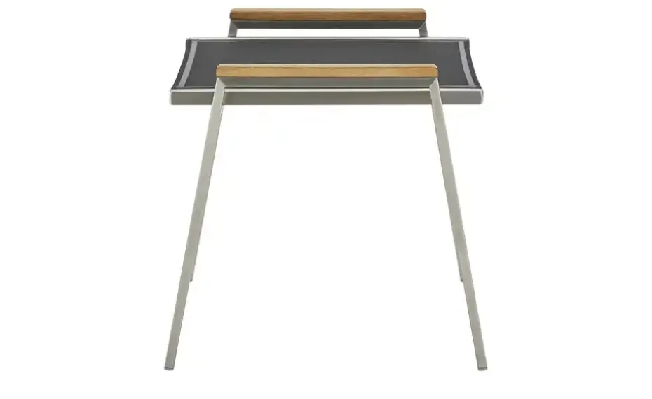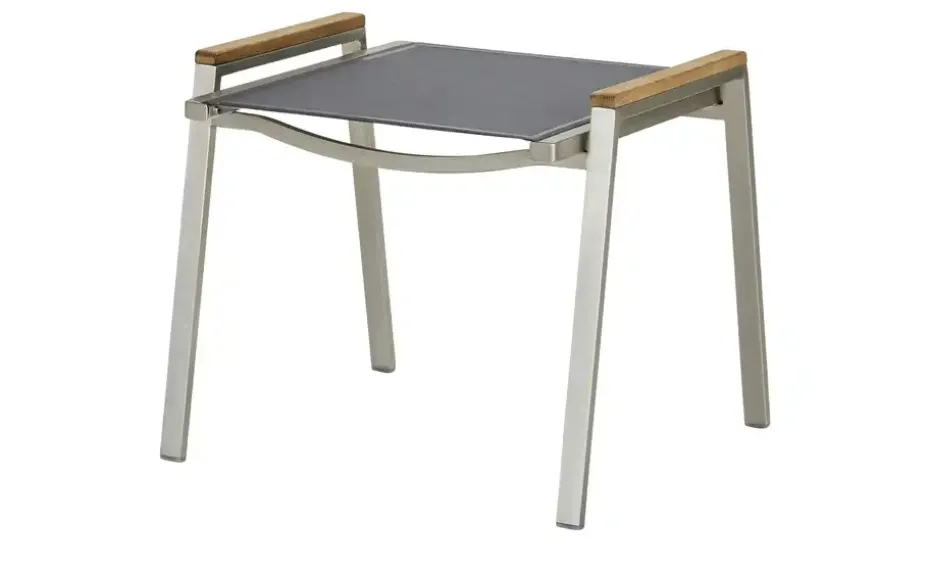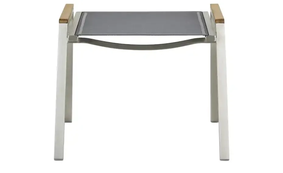 One ist ein Hocker von der Marke Zebra und passt zu den Klappsesseln der Serie. Vor den Sessel gestellt, können Sie darauf die Beine ablegen und es sich so noch gemütlicher machen. Die Sitzfläche besteht aus einem Kunststoff in Textiloptik; für das Gestell ist stabiler Edelstahl verwendet worden. Am oberen Ende befinden sich Absetzungen aus edlem Teakholz.