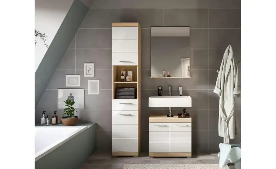 Entdecken Sie die perfekte Kombination aus Stil und Funktionalität für Ihr Badezimmer mit unserer Badkombination in Sonoma Eiche hell und weißem Hochglanz. Sie bietet bietet ausreichend Stauraum und verleiht Ihrem Raum einen modernen und ansprechenden Look. Tauchen Sie ein in zeitlose Eleganz und optimale Organisation mit diesem einzigartigen Möbelstück.