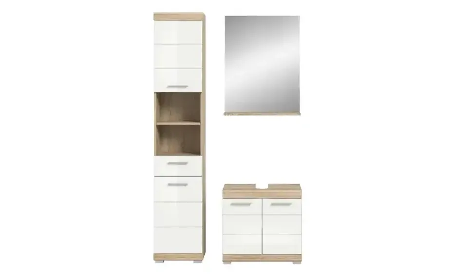 Badmöbel-Set SCHLOONSEE, 3 teilig, bestehend aus: Hochschrank, Waschbeckenunterschrank, Spiegel Schloonsee | Eiche Sonoma (Nachbildung), Weiß, hochglanz