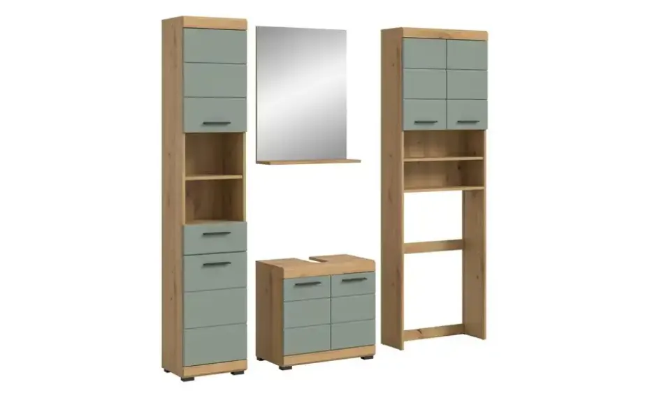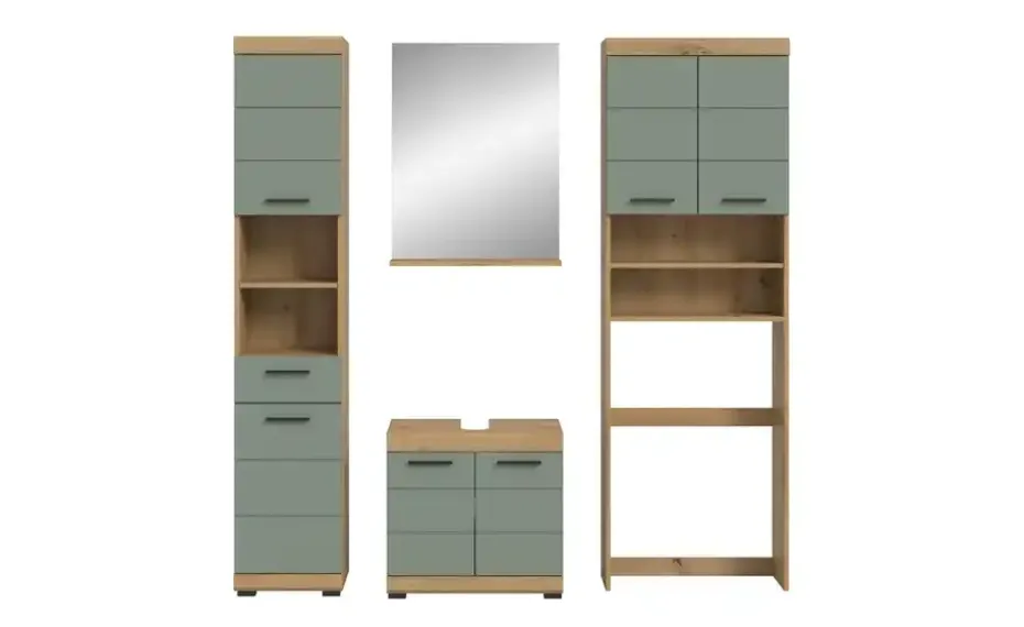 Badmöbel-Set SCHLOONSEE, 4 teilig, bestehend aus: Hochschrank, WBU, Badspiegel, Waschmaschinenumbauschrank Schloonsee | Eiche Artisan (Nachbildung), Salbeigrün