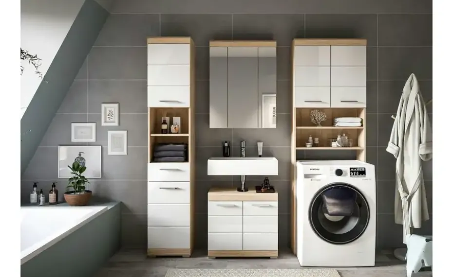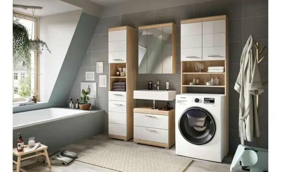 Entdecken Sie die perfekte Kombination aus Stil und Funktionalität für Ihr Badezimmer mit unserer Badkombination in Sonoma Eiche hell und weißem Hochglanz. Sie bietet bietet ausreichend Stauraum und verleiht Ihrem Raum einen modernen und ansprechenden Look. Tauchen Sie ein in zeitlose Eleganz und optimale Organisation mit diesem einzigartigen Möbelstück.