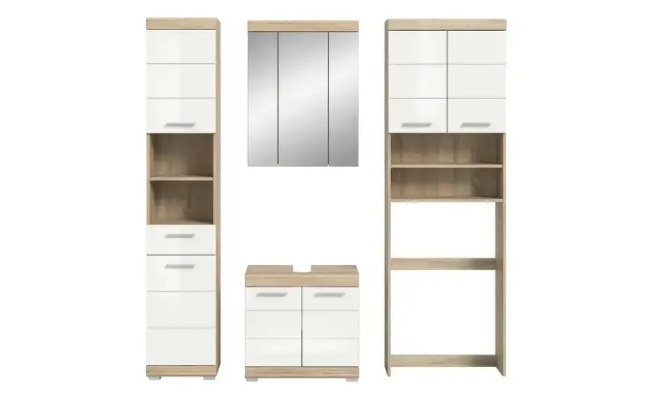 Badmöbel-Set SCHLOONSEE, 4 teilig, bestehend aus: Hochschrank, WBU, Spiegelschrank, Waschmaschinenumbauschrank Schloonsee | Eiche Sonoma (Nachbildung), Weiß, hochglanz