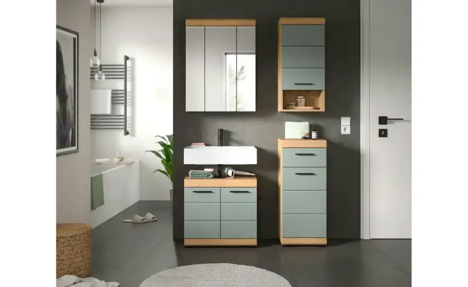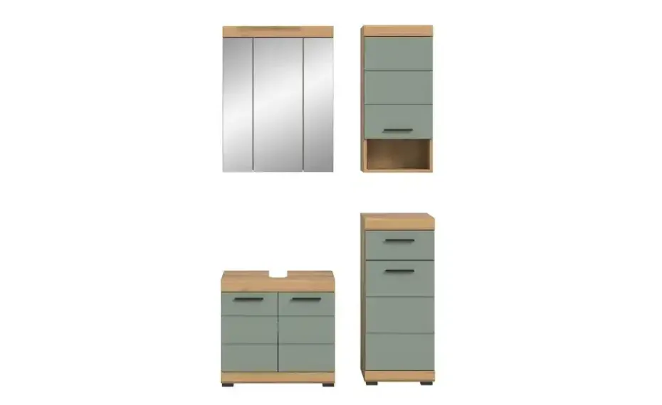 Badmöbel-Set SCHLOONSEE, 4 teilig, bestehend aus: Waschbeckenunterschrank, Spiegelschrank, Unterschrank, Hängeschrank Schloonsee | Eiche Artisan (Nachbildung), Salbeigrün