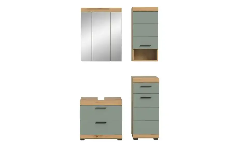 Badmöbel-Set SCHLOONSEE, 4 teilig, bestehend aus: Waschbeckenunterschrank, Spiegelschrank, Unterschrank, Hängeschrank Schloonsee | Eiche Artisan (Nachbildung), Salbeigrün