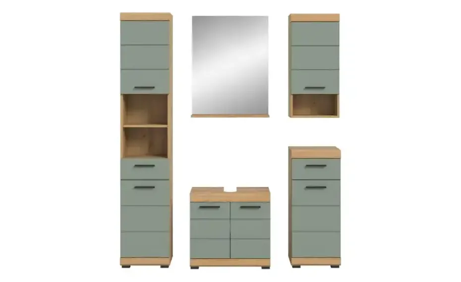 Badmöbel-Set SCHLOONSEE, 5 teilig, bestehend aus: Hochschrank, WBU, Spiegel, Unterschrank, Hängeschrank Schloonsee | Eiche Artisan (Nachbildung), Salbeigrün